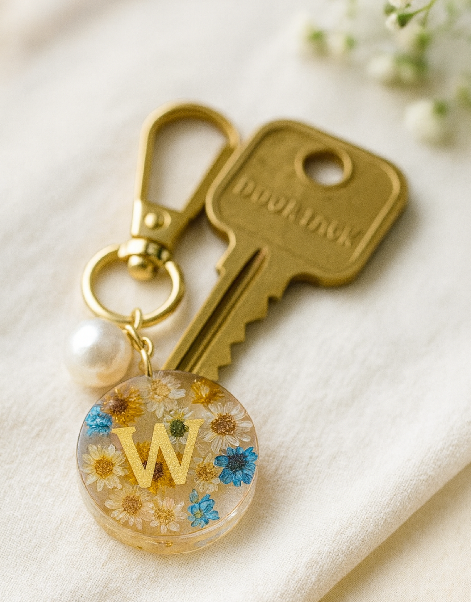 Showcase your individuality with this personalized initial flower keychain, handcrafted in resin and adorned with real dried flowers for a one-of-a-kind burst of color. Each piece features a gold-tone initial, glossy finish, and pearl accent, making it the ideal accessory for bags, purses, or keys.